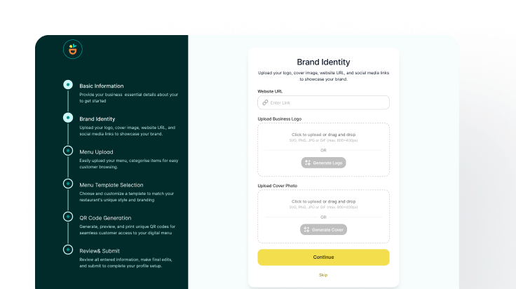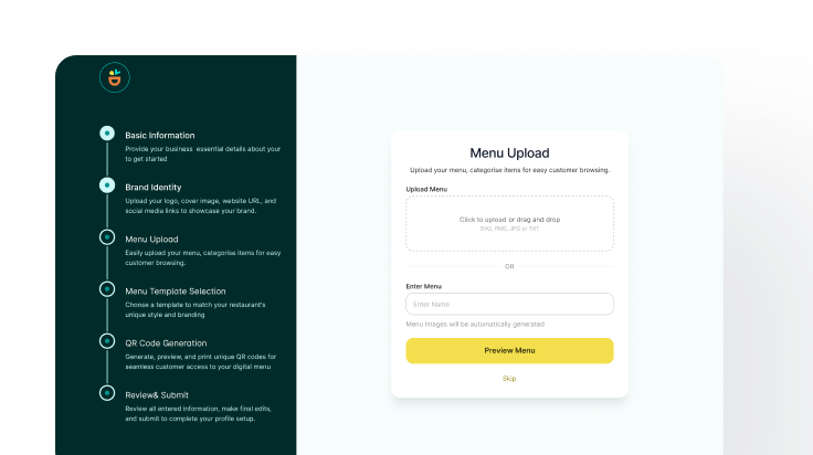 Sign up, fill in your restaurant details, and upload your menu items quickly and easily. No technical expertise required. Our support team is always available to assist you